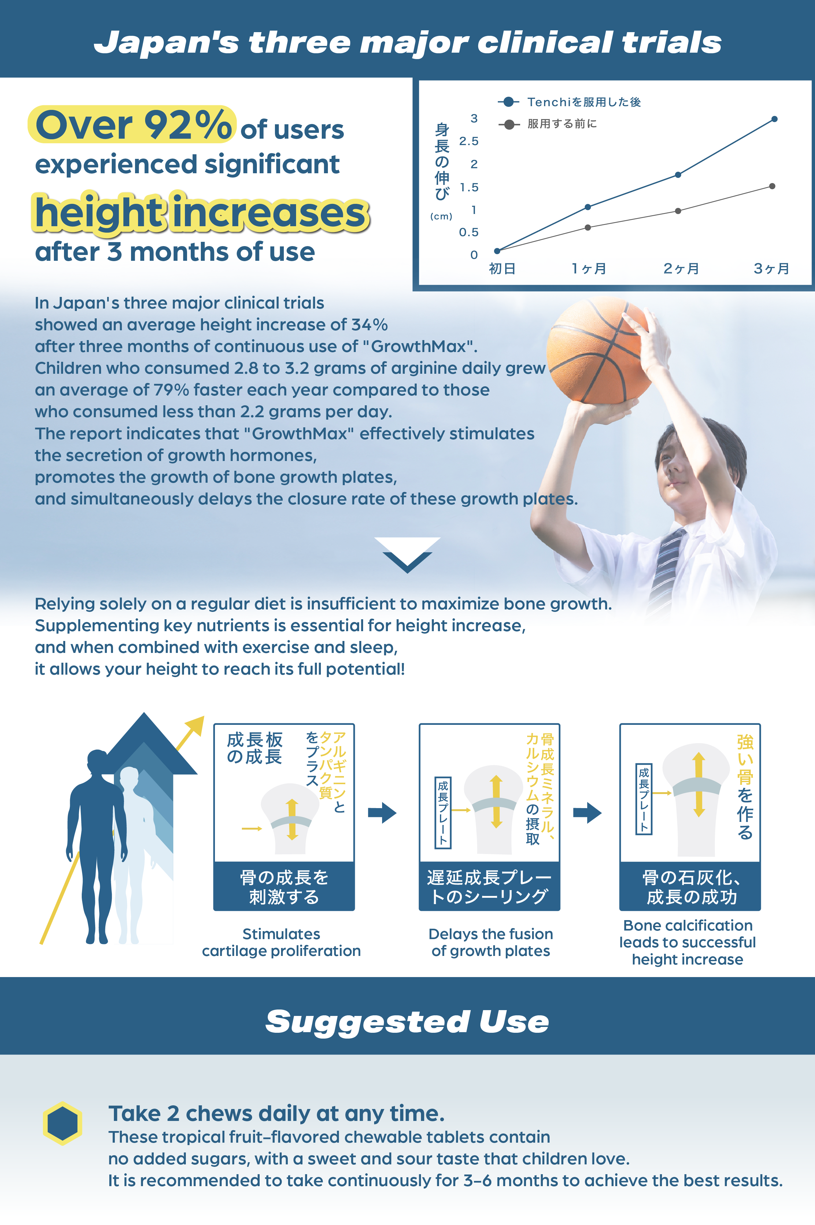 In three major clinical trials in Japan involving 600 participants aged 5 to 22, over 92% of testers experienced an average height increase of 34% after taking GrowthMax Chews continuously for three months. The report indicates that GrowthMax Chews effectively stimulates the secretion of growth hormones, promotes the growth of the growth plate, and simultaneously slows the closure rate of the growth plate.