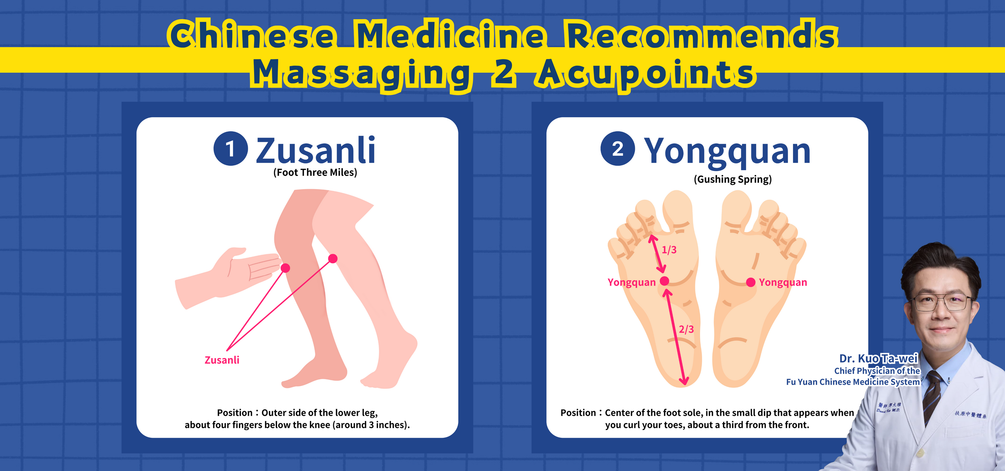 ^ Dr. Kuo Ta-wei, Chief Physician of the Fu Yuan Chinese Medicine System, recommends two acupoints: Zusanli (Foot Three Miles) and Yongquan (Gushing Spring) (Source: YouTube).