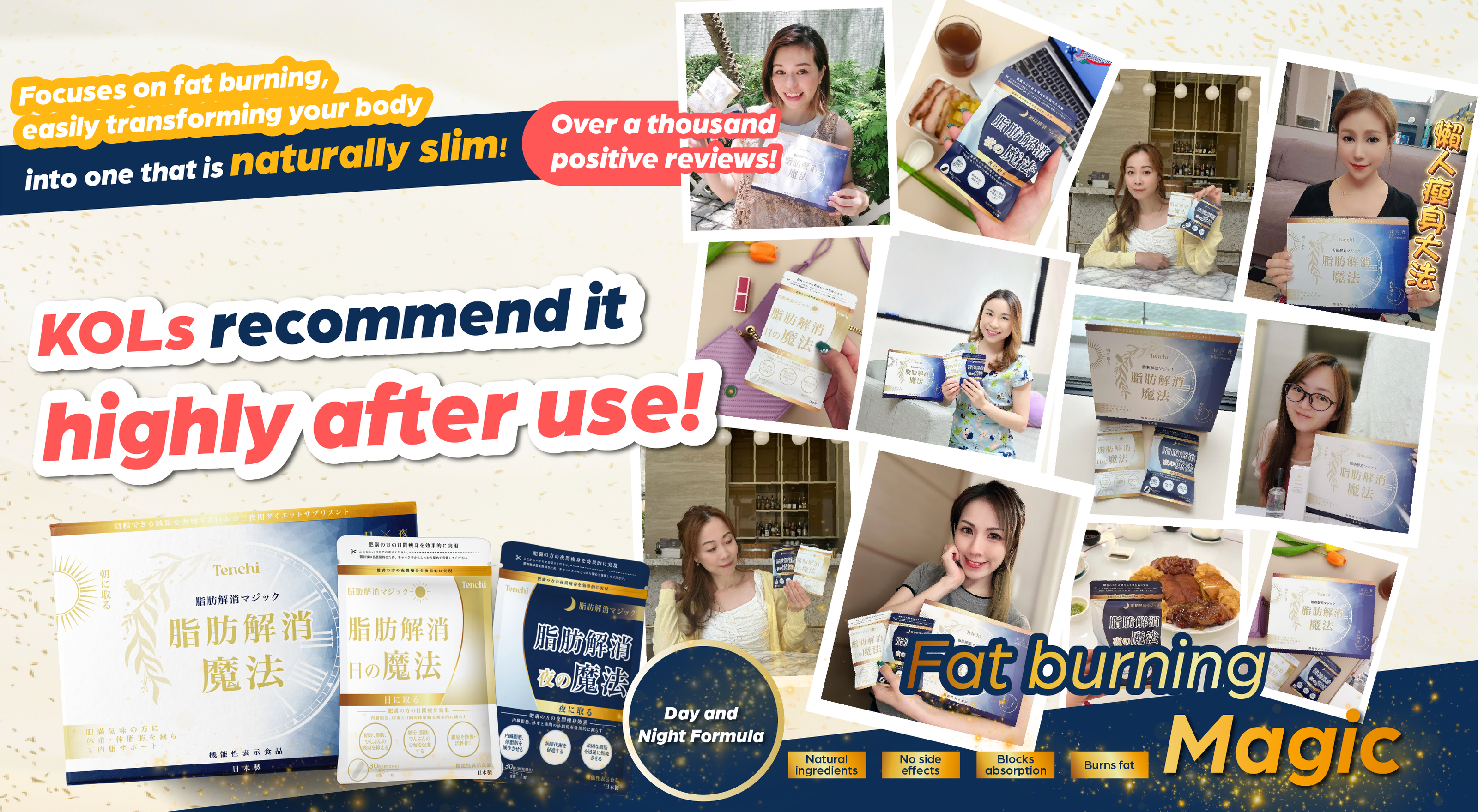 ▲ The Tenchi Fat Burner offer a dual-action formula designed for day and night use. The Day Formula blocks absorption, while the Night Formula burns fat. Together, they promote fat breakdown, prevent accumulation, enhance muscle repair and growth, reduce fat production, and help you regain a toned body—effectively banishing belly fat and eliminating the tendency to gain weight.