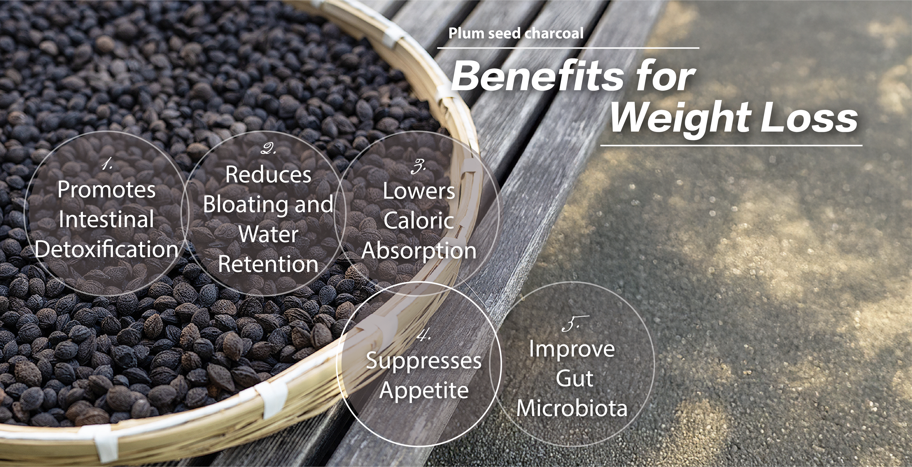 Plum seed charcoal can adsorb fats and sugars from food, preventing these high-calorie components from being fully absorbed by the intestines, thereby reducing overall calorie intake.