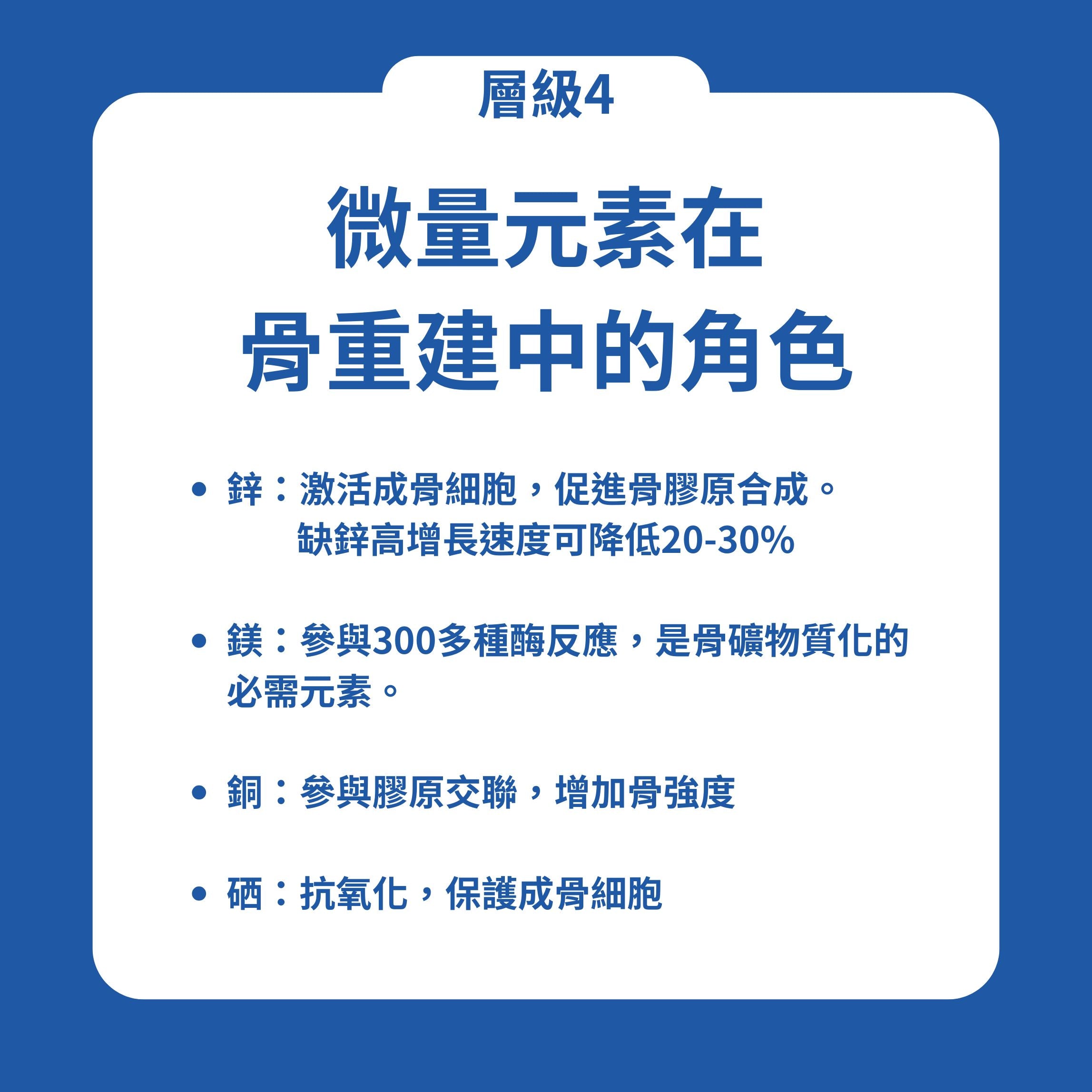 - 鎂:參與300多種酶反應,是骨礦物質化的必需元素。促進維生素D激活
