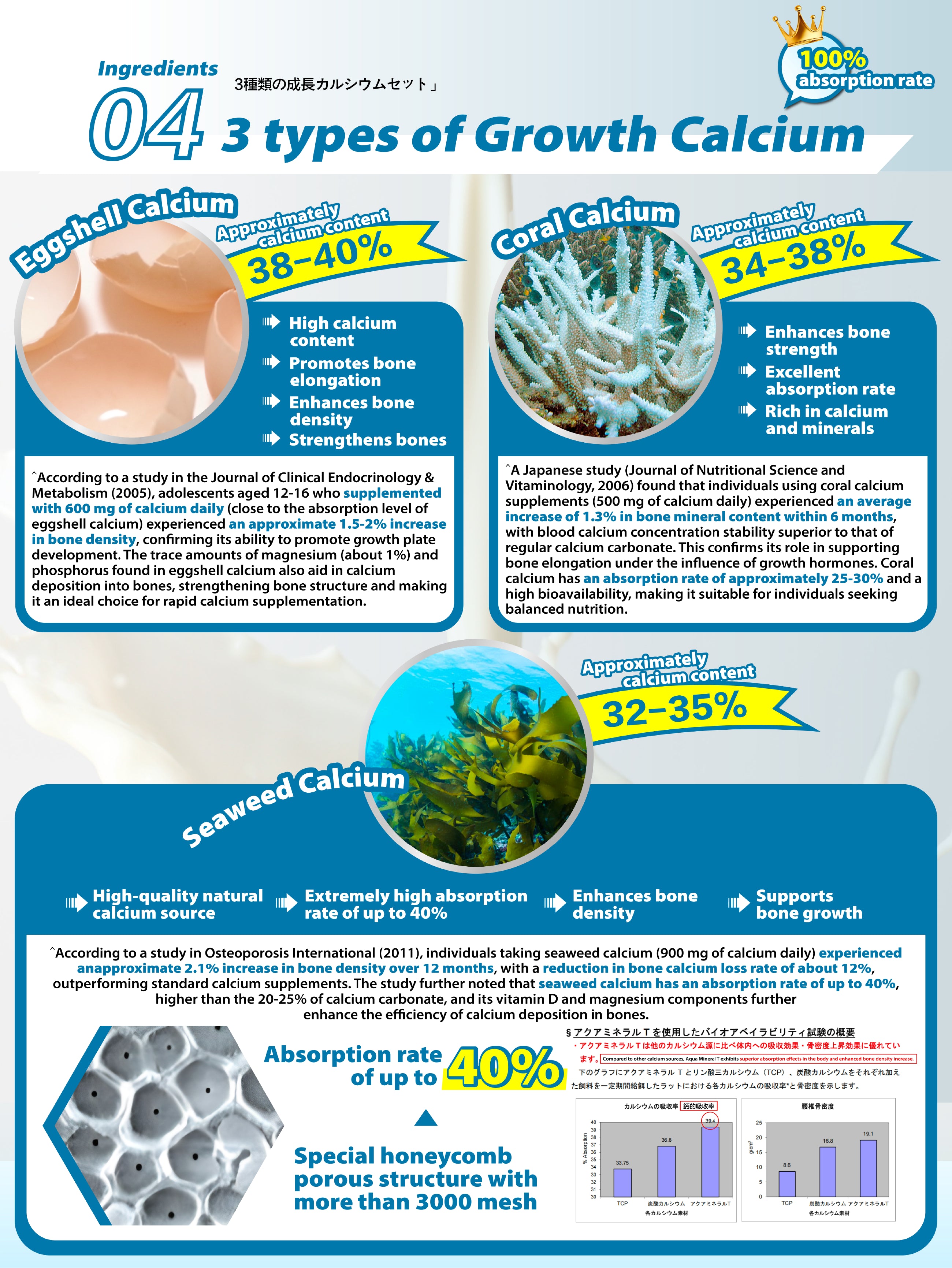 🦴 3 Types of Growth Calcium (Eggshell Calcium, Seashell Calcium, Seaweed Calcium): Provide highly absorbable calcium to strengthen bone structure.