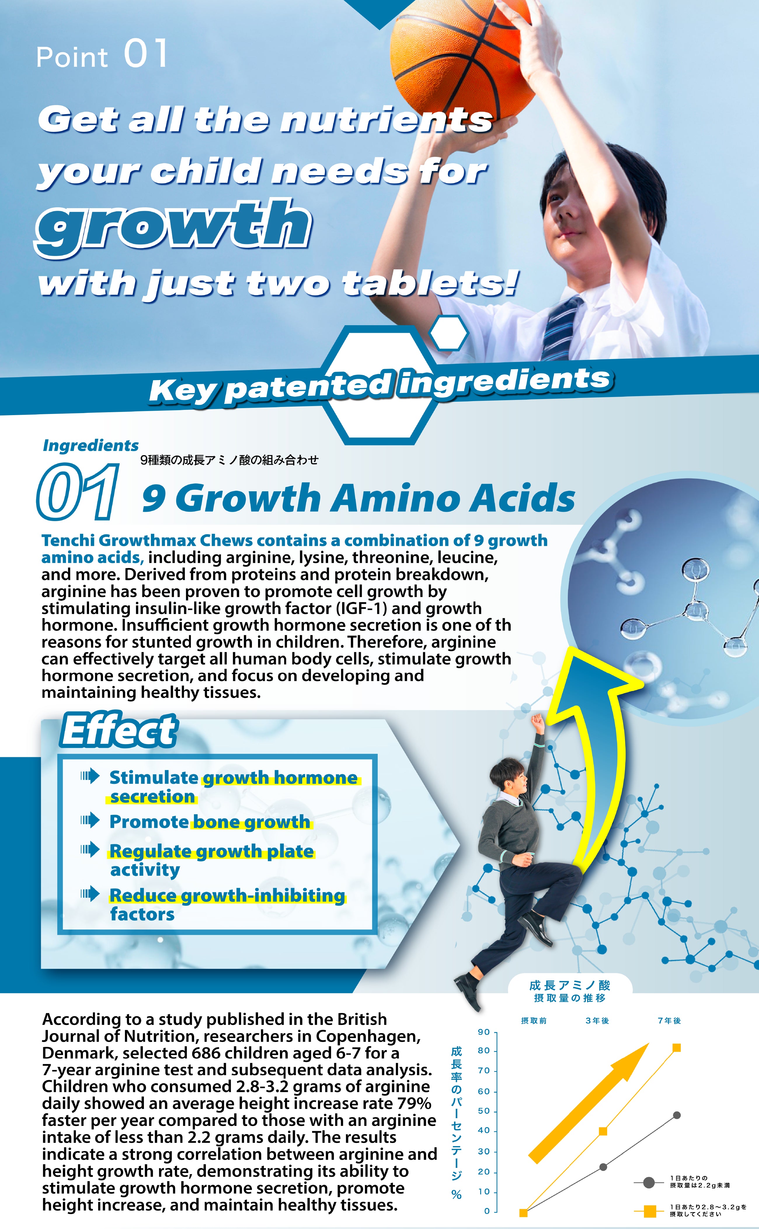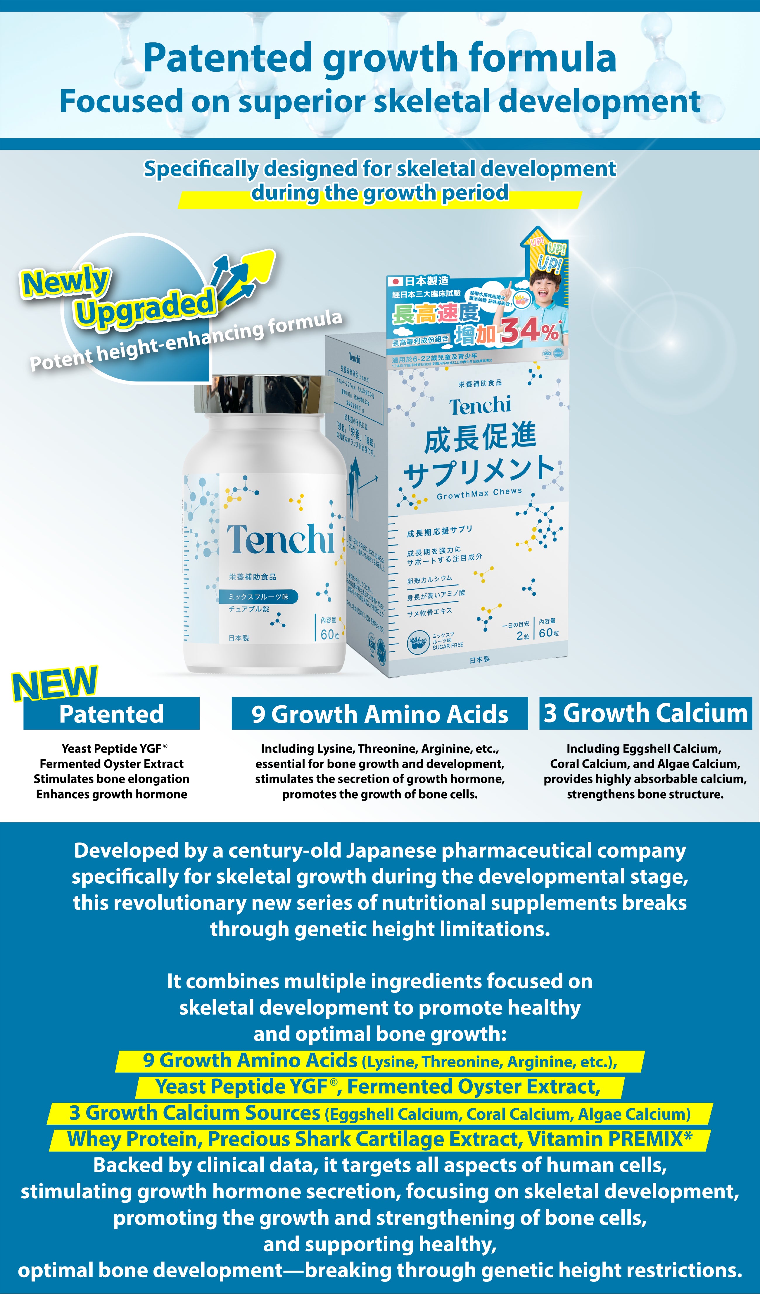 Tenchi GrowthMax Chews are a height-enhancing supplement developed and manufactured by a century-old, publicly listed Japanese pharmaceutical company. Specially designed for adolescents during their growth phase, it helps them break through genetic limitations and achieve their ideal height.