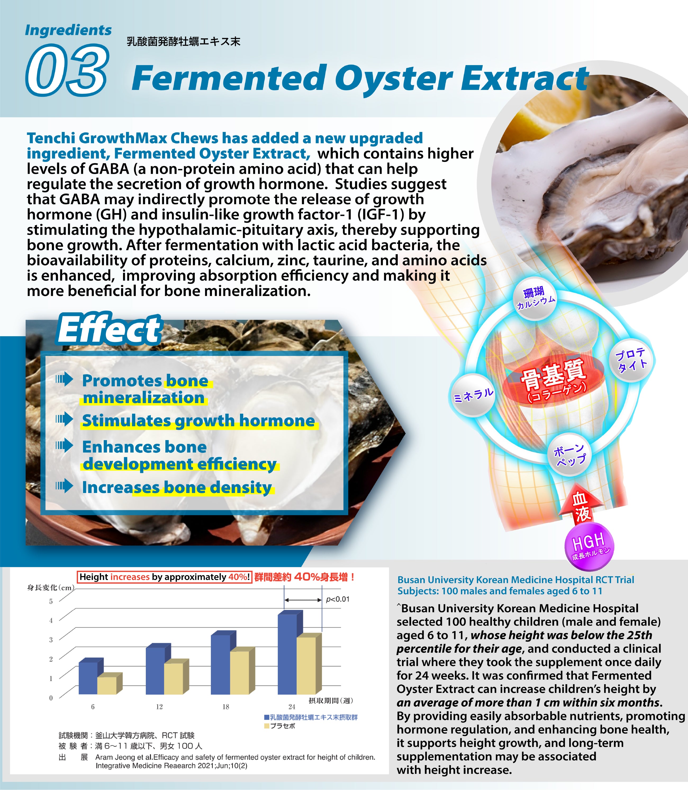 🦪 Oyster Extract: Contains abundant zinc, taurine, calcium, and various trace elements. It promotes metabolism and helps enhance bone density and support cellular repair.