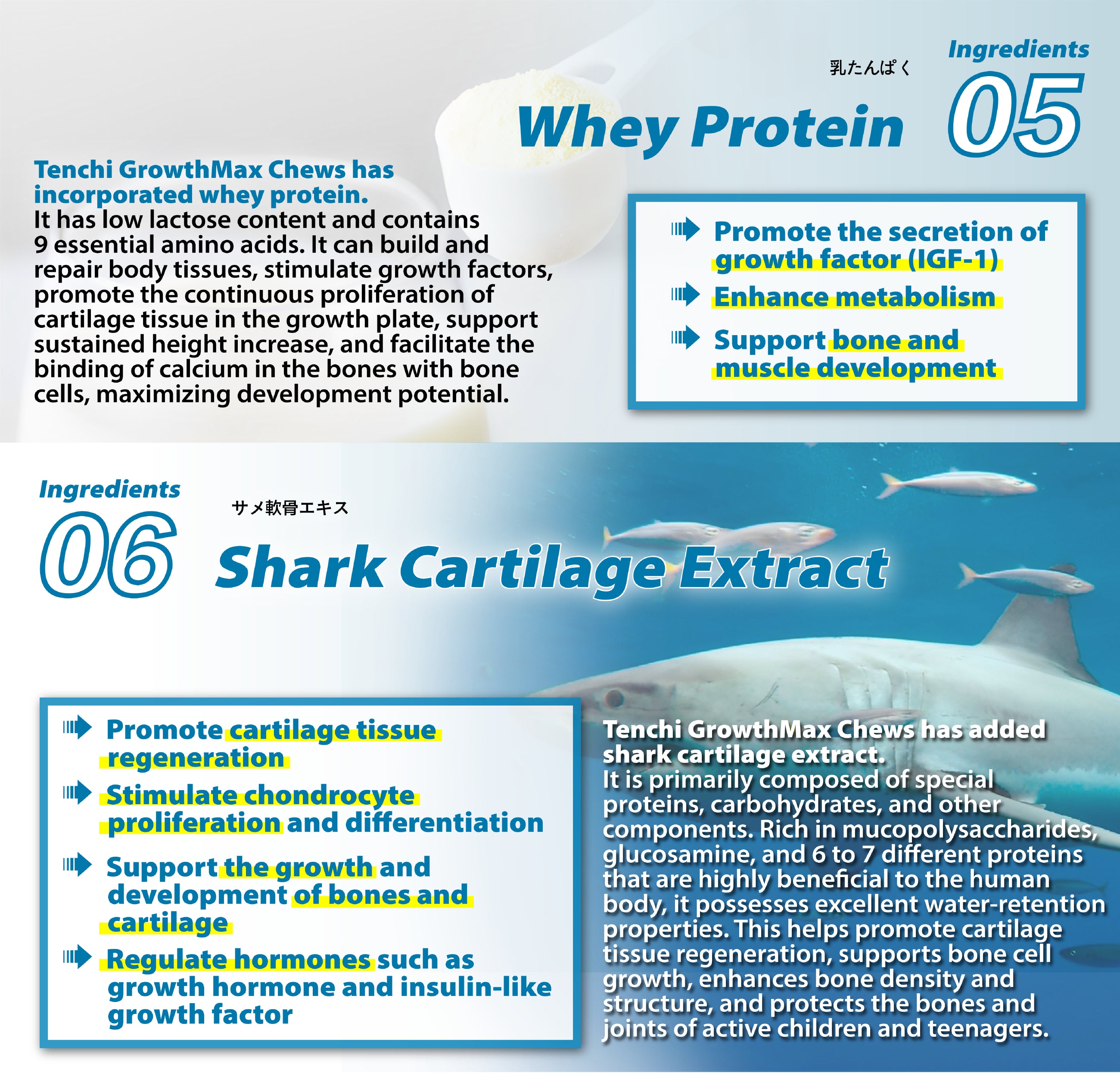 🍃 Whey Protein: A high-quality protein source that works synergistically with amino acids to activate growth factors and accelerate the development of cartilage in the growth plates.