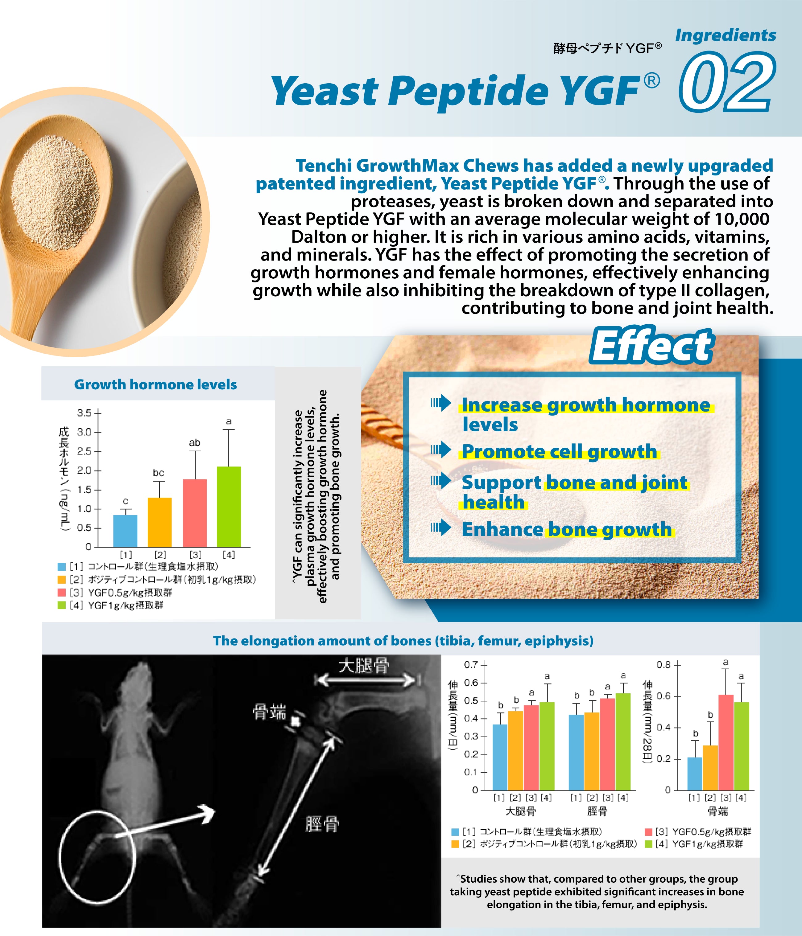 🧬 Patented YGF Yeast Peptide®: Derived from natural yeast, it's rich in unique small-molecule bioactive peptides that effectively enhance nutrient absorption, activate growth factors, and support the development of bones and cartilage.